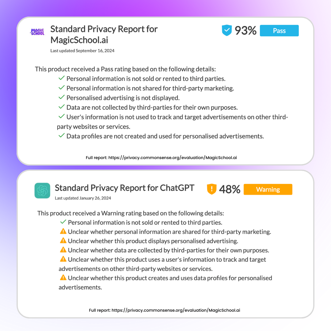 We're honored to announce that MagicSchool received a 93% privacy rating, placing at the top of AI tools for schools in Common Sense Media's independent privacy evaluations. We share in Common Sense's mission to create coordinated effort to protect child and student privacy, and build in safety and security from the start.